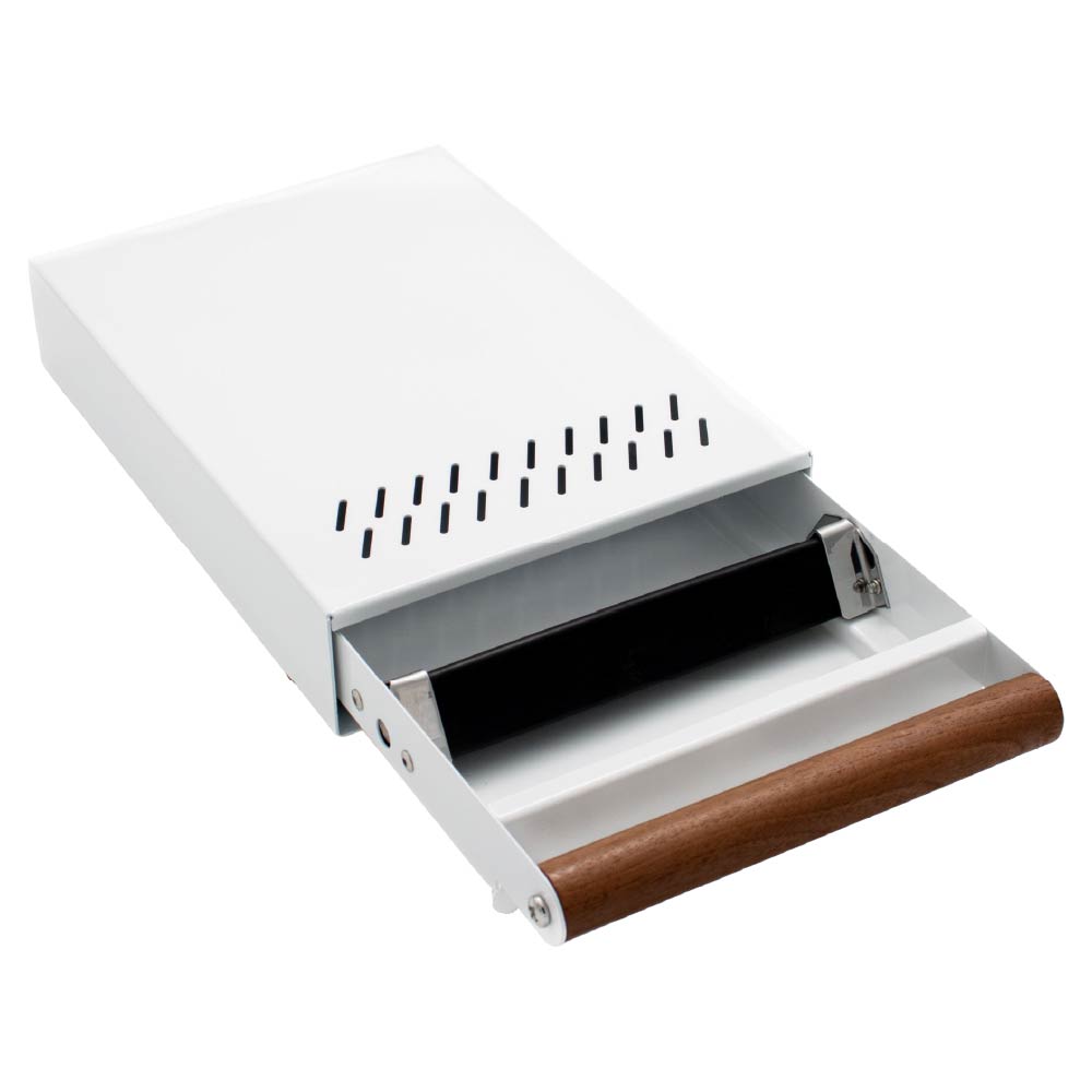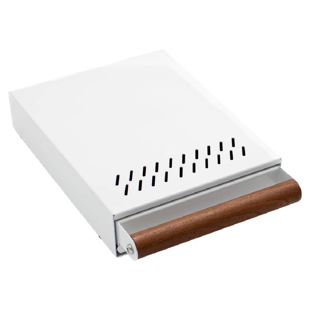 De Pro Cub Uitkloplade Medium Wit voor het gemakkelijk uitkloppen van koffiepucks. Deze robuuste knockbox drawer is voorzien van een walnoothouten handvat wat een luxe uitstraling geeft. Dankzij het formaat van 20 x 30 x 5,5 cm passen er veel pucks in zonder dat de lade teveel ruimte inneemt. De lade is gemaakt van 1,2mm dik RVS waardoor je met gemak een zware koffiemolen bovenop plaatst voor extra ruimtebesparing. Nylon ladegeleiders zorgen ervoor dat de lade soepel open en dicht schuift. De uitklopstang heeft een kern van RVS met daaromheen rubber voor demping van geluid. Uitgerust met ventilatiegaten om vocht af te voeren.
